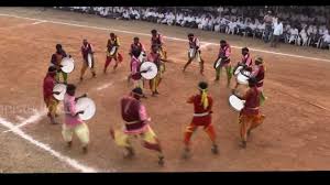 tied to the top.In the third stage the performers dance with spears and tridents pierced into their ankles, hands and tongue. This is called ‘Narasam’. The dancers are dressed in colorful knee-length dhotis secured by waist-sashes smeared with vibhuti all over their body. The main percussion instrument is the ‘Veeranam’ or ‘war-drum’.